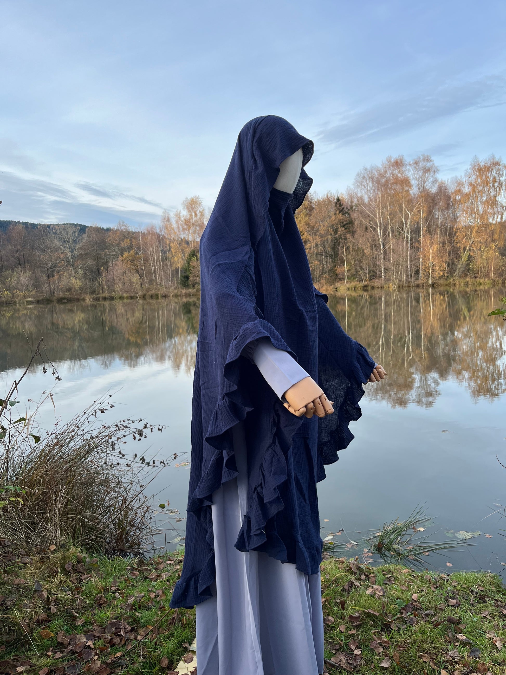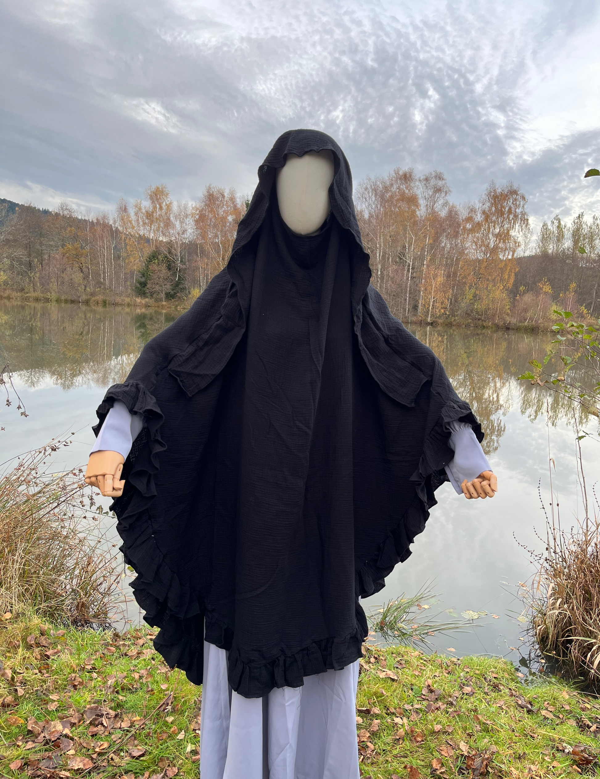 - Froufrous sur le bas du khimar pour une touche d’élégance.